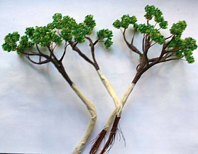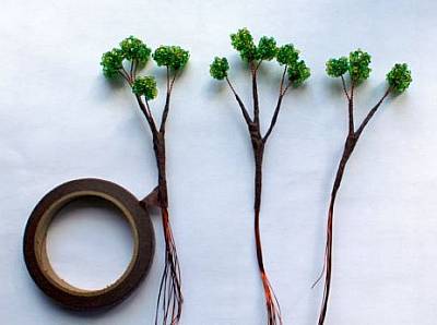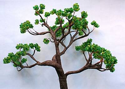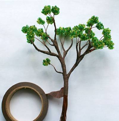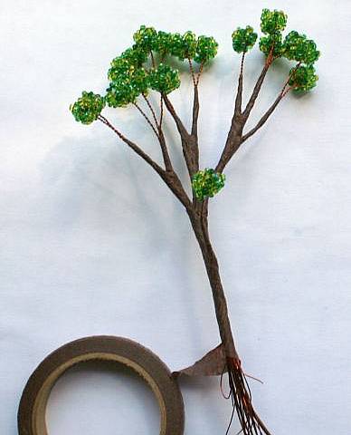 7. Осталось окончательно собрать дерево. Возьмите центральную ветку и прикрепляйте к ней остальные ветки. Не забывайте утолщать ствол с помощью малярного скотча. Дерево из бисера готово! Осталось его посадить в горшок ![]()