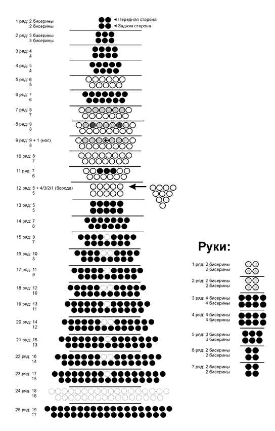 Плетение идет сверху вниз и начинается с кончика шапки. Игрушка состоит из парных рядов, первый из которых при плетении выдвигается вперед и образует лицевую сторону, а второй, соответственно, отодвигается назад. На схеме (в конце урока) указан номер ряда, а также количество бисерин, которые используются для лицевой и задней стороны.