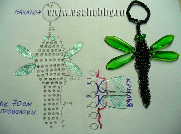 Особую загадочность ей придают полупрозрачные бусины — глаза и крылья. Но даже если у Вас нет бусин для крыльев нужной формы, не стоит отчаиваться! Ниже схема плетения простой стрекозы.