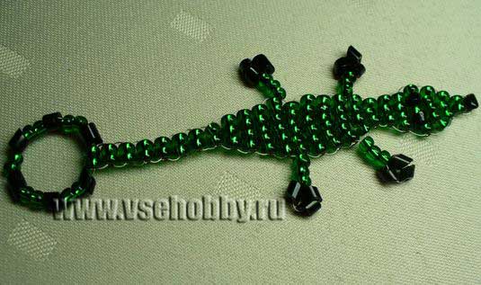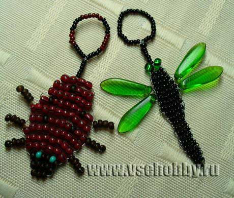 Сделаем симпатичные сувениры из бисера — брелки: божью коровку, стрекозу и ящерицу.