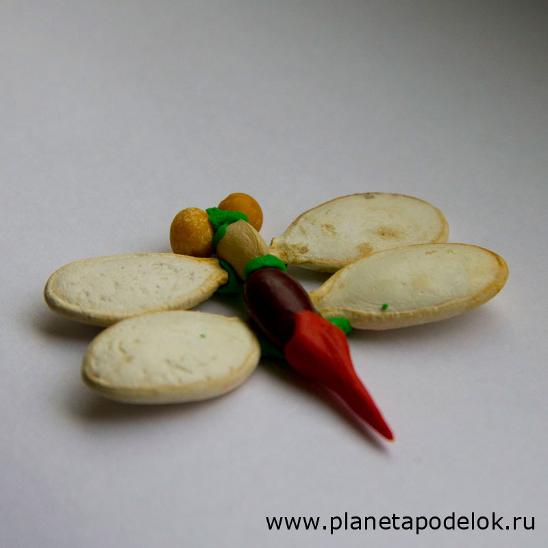 Стрекоза 30.05.2010Поделки из природных материаловстрекозаmotor Поделиться... Глаза стрекозы сделаны из горошин, туловище из белой и красной фасолин, крылья из тыквенных семечек. Части стрекозы крепите с помощью пластилина, хвост также сделан из пластилина.