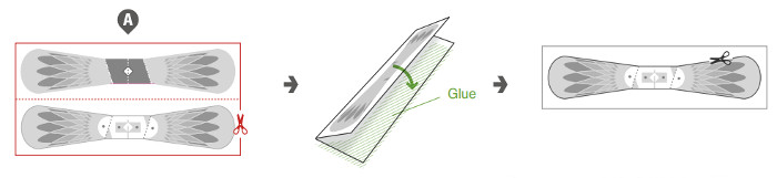 1. Вырежьте из шаблона прямоугольник с верхней и нижней частью крыла по красным линиям. Согните вырезанный прямоугольник по красной пунктирной линии и склейте. После того как клей высохнет, вырежьте крыло.