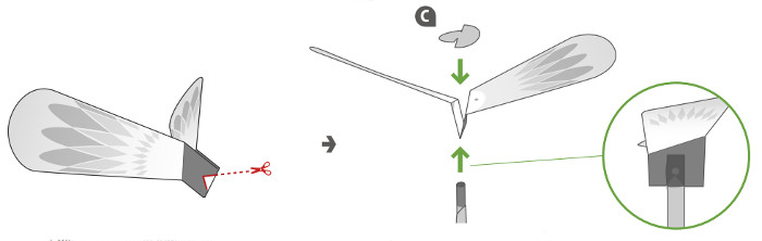 3. Согните крыло по линиям и вырежьте треугольный кусочек снизу. Оденьте крыло на вал через прорезь и зафиксируйте клеем. Сверху приклейте круглую заглушку.