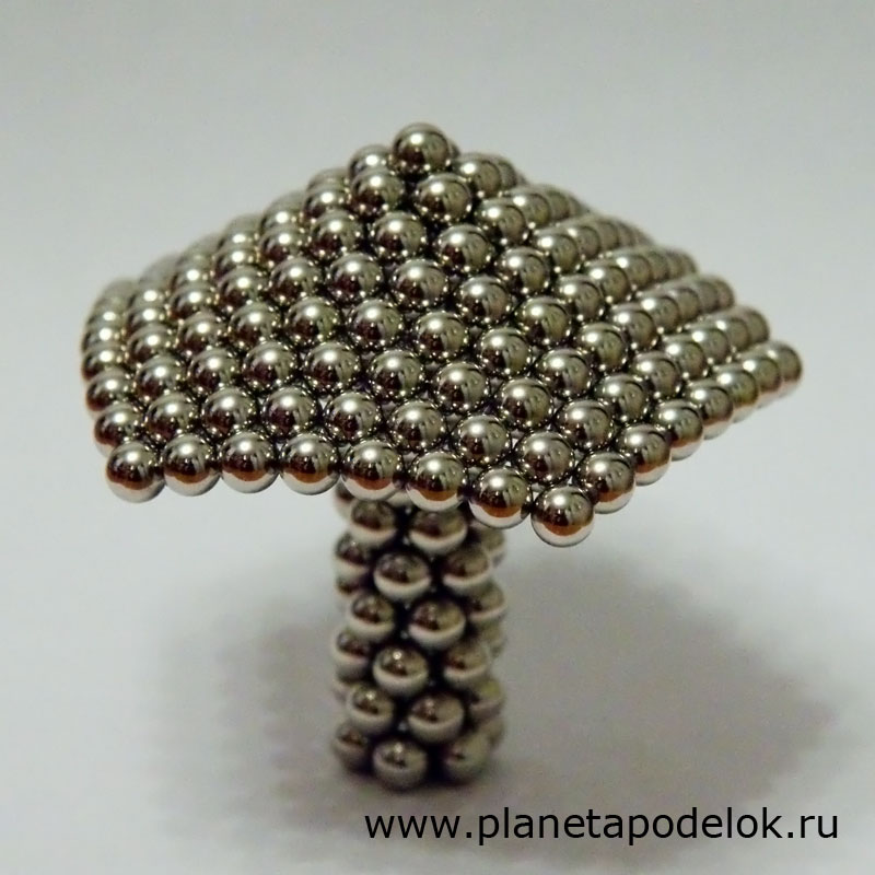 Шляпа гриба – это пятигранник. Чтобы его сделать, сделайте днинную цепочку из шариков и наматывайте её вокруг одного центрального шарика, сразу формируя пятигранник. Когда вы сделаете 7 рядов вокруг центрального шарика можете приступать к формированию ножки.