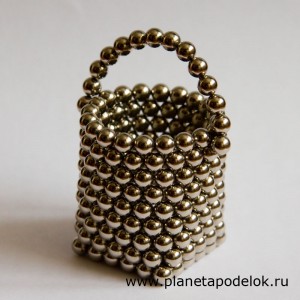 После того как корзинка готова сделайте ручку из «цепи» шариков и прикрепите её к корзинке как показано на рисунке. Мы сделали ручку из 14-ти шариков. Сделайте нахлёст в несколько шариков, чтобы соединение получилось прочнее. Корзинка с квадратным дном готова.
