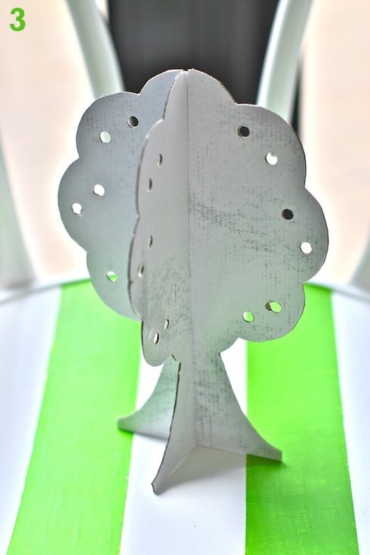 5. После того как клей высохнет, можно снять скотч, приклеенный на предыдущем шаге. Покрасьте дерево серебристой краской. Если хотите, можно нарисовать на дереве узоры, например, спиральки, а на стволе поставить точки. Здесь всё зависит от дизайна помещения, в котором будет стоять дерево. Дерево готово! Можно вешать украшения!