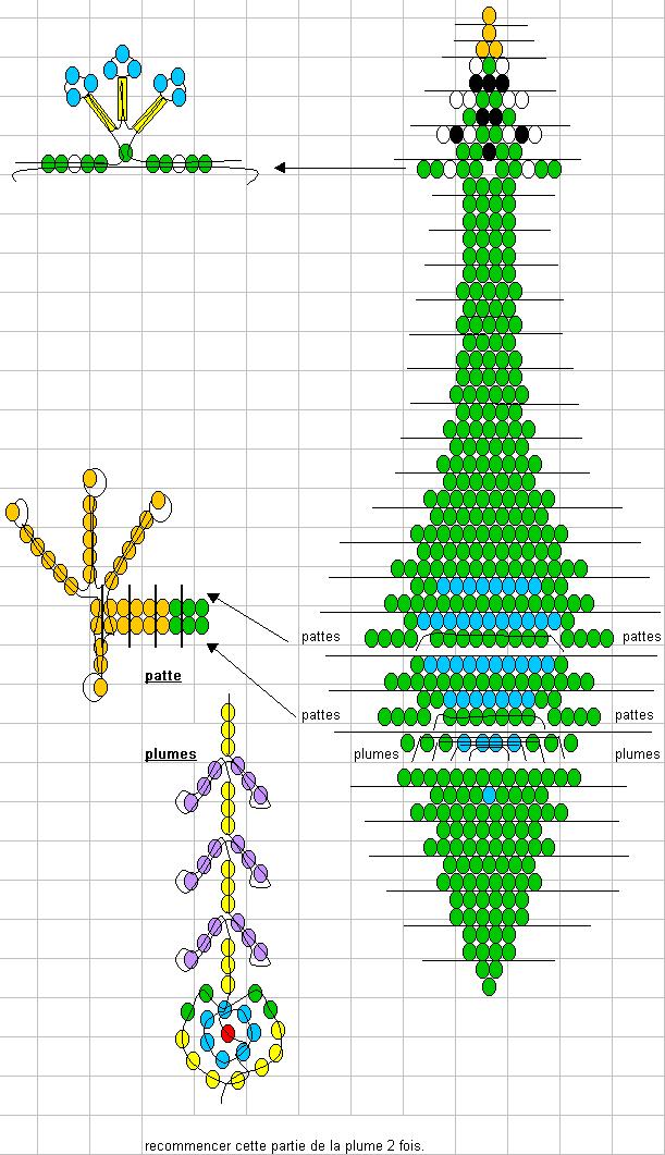 Для плетения павлина возьмите проволочку длиной 2 м. Вам также понадобится бисер следующих цветов: черный, желтый, оранжевый, зеленый, сиреневый, белый, красный и голубой. Начните с клюва. Не забудьте вставить проволочки для лапы и 8 проволочек по 40 см для перьев.