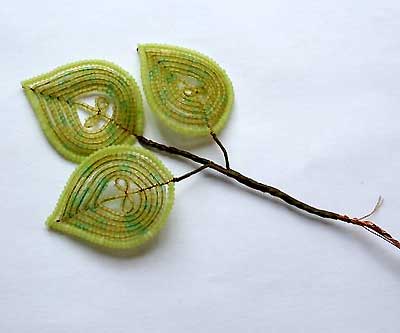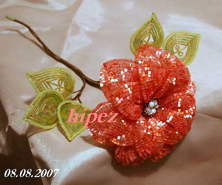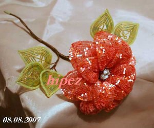 Такой цветок изготавливается по французской технике плетения цветов (плетение дугами). Для того, чтобы сплести такой же цветок, вам понадобятся следующие материалы: бисер — рубка кораллового и оранжевого цвета (50гр), зелёная рубка двух оттенков (около 15-20гр), круглый матовый бисер в тон основному зелёному (5гр.), сетка круглая на 14 дырочек по внешнему краю, семь бусин белого цвета, золотистый бисер (около грамма) на серединку цветка, проволока, леска, флористическая лента и шёлковые нитки зелёного цвета.