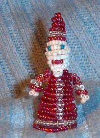 Эта несложная в исполнении игрушка может стать как новогодним сувениром, так и елочным украшением. Мой опыт показывает, что Дед Мороз – отличный подарок к празднику «на скорую руку» (плетение занимает около часа). Начиная работать с объемными игрушками, я столкнулась с проблемой, на которую жалуются многие: трудно достать подходящую проволоку. Но эту фигурку вы сможете сплести как на проволоке, так и на леске. Второй вариант потребует немного больше терпения, однако игрушка получится вполне устойчивой и, может быть, даже более прочной. Затягивать леску в процессе плетения нужно как можно туже. К специфике плетения на леске мы вернемся ближе к завершению работы.