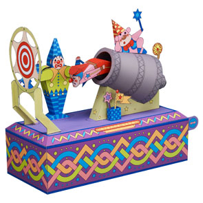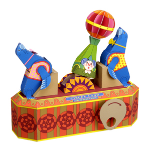 Объёмная картина «Добро пожаловать в цирк» изображает танцующую девочку и смешных клоунов, которые приветствуют вас в цирке, вместе с животными, когда вы тяните рычажок вниз.